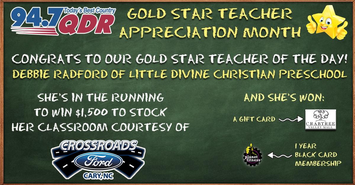 Our QDR Gold Star Teacher of the Month for October is Tabitha Hinnant, teacher at Rand Road Elementary School Tabitha was nominated by her teachers assistant Traci who said, “I work with Tabitha. She is a special education teacher for grades 2 through 5. She has a vast array of experience working in high schools,…… Continue Reading