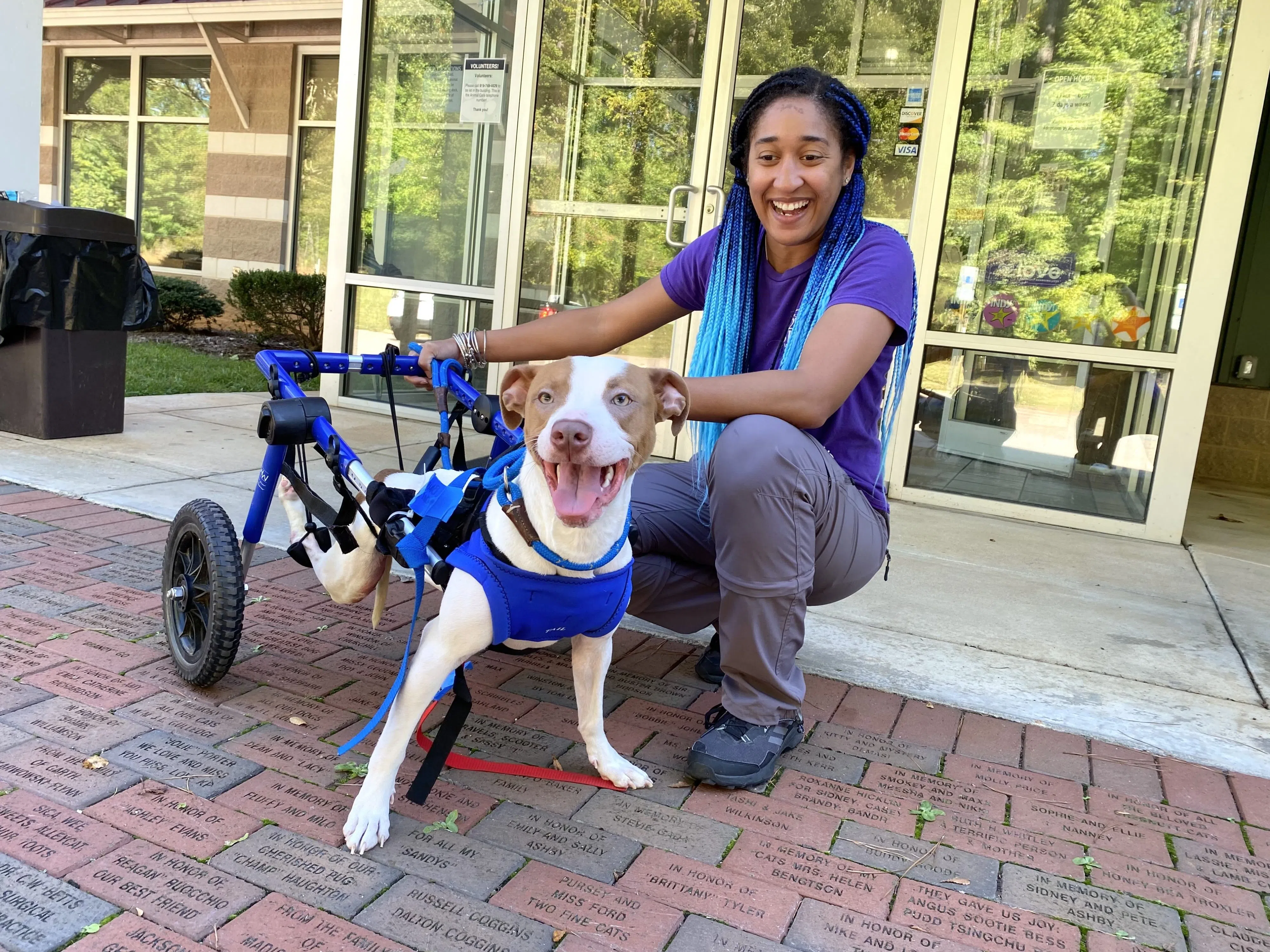 Harper is a survivor! This 1-year-old dog was rescued by a good Samaritan from the side of the road. She was stuck in a trash bag, and her finder quickly realized she couldn’t use her back legs. It turns out Harper is paralyzed from what looks like an old injury. It’s not clear exactly what she’s been through, but despite her difficult start to life, Harper simply could not be a happier dog! She has gotten to experience a wheelchair at SPCA Wake, and she took to it like an absolute pro. It was hard to believe how fast she started running once she had some wheels behind her! And when she gets to run, Harper’s smile takes over her whole face. Unlike most paralyzed dogs, Harper does have some potty control! She’s surprisingly good at holding her bladder. But she gets diapers sometimes at night to help her make it through to the next day. This sweet girl was lucky to have been found, and now she’s looking for a loving family to show her how rich and wonderful her life can be. Harper doesn’t seem to mind other dogs, so she would probably be fine in a household with or without dog siblings. Harper’s adoption fee is $95 which includes her spay, microchip, vaccines, and some special tools to help her get around as a paralyzed dog. Interested adopters can get more information about Harper at spcawake.org