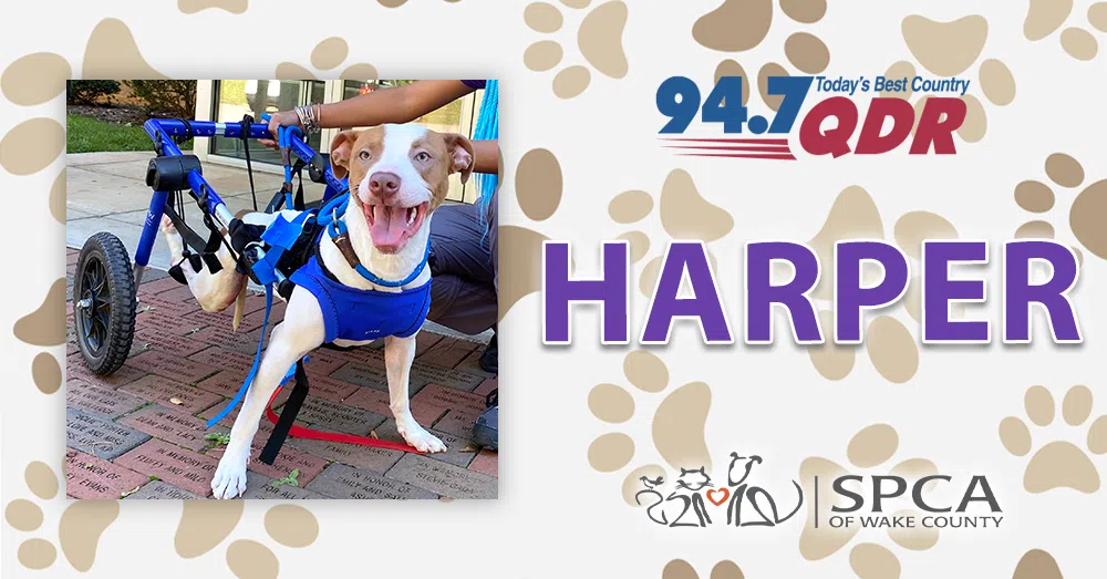 Harper is a survivor! This 1-year-old dog was rescued by a good Samaritan from the side of the road. She was stuck in a trash bag, and her finder quickly realized she couldn’t use her back legs. It turns out Harper is paralyzed from what looks like an old injury. It’s not clear exactly what she’s been through, but despite her difficult start to life, Harper simply could not be a happier dog! She has gotten to experience a wheelchair at SPCA Wake, and she took to it like an absolute pro. It was hard to believe how fast she started running once she had some wheels behind her! And when she gets to run, Harper’s smile takes over her whole face. Unlike most paralyzed dogs, Harper does have some potty control! She’s surprisingly good at holding her bladder. But she gets diapers sometimes at night to help her make it through to the next day. This sweet girl was lucky to have been found, and now she’s looking for a loving family to show her how rich and wonderful her life can be. Harper doesn’t seem to mind other dogs, so she would probably be fine in a household with or without dog siblings. Harper’s adoption fee is $95 which includes her spay, microchip, vaccines, and some special tools to help her get around as a paralyzed dog. Interested adopters can get more information about Harper at spcawake.org