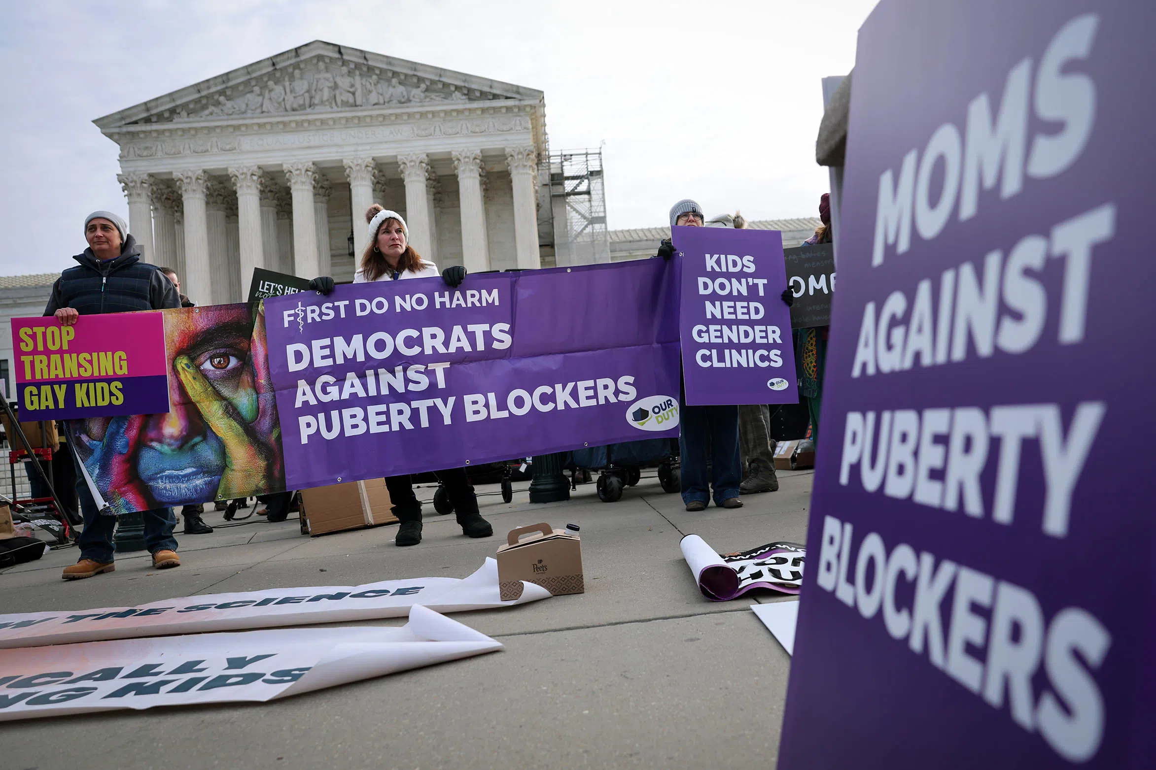 There were dueling rallies outside the court in the hours before the arguments. Speeches and music filled the air on the sidewalk below the court’s marble steps. Advocates of the ban bore signs like “Champion God’s Design” and “Kids Health Matters,” while the other side proclaimed “Fight like a Mother for Trans Rights” and “Freedom to be Ourselves.”