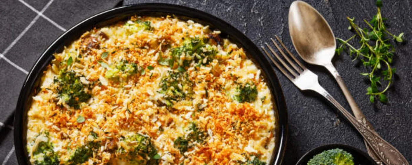 - Assemble casserole: Stir broccoli into the baked rice mixture. Transfer the mixture to a broiler-safe dish, if desired. Top with the prepared breadcrumb mixture.
