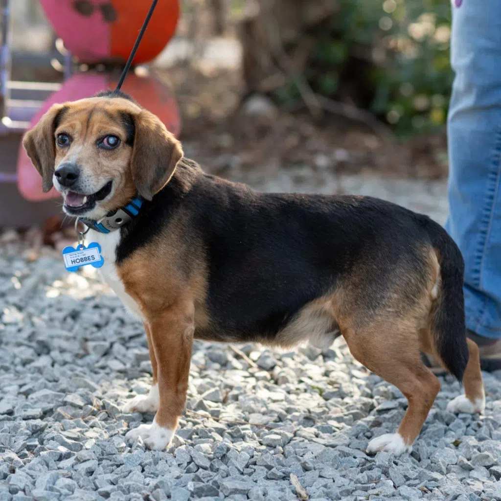 Beagle lovers, have we got the dog for you! Hobbes is a gentleman who enjoys leisurely walks, taking the time to roll in the grass, and sniffing out the perfect stick to carry along. He enjoys meeting other dogs and their people while walking. Hobbes has excellent potty and crate manners when kept on a schedule, standing by the door to tell us it is time to go outside. He does well in the car – watching the scenery before settling down for a nap. Hobbes likes to be near you, sitting on or behind your feet while working in the office and beside you on the couch. If you have a free hand, he is flopping on his back and begging for a belly rub. Hobbes’ favorite food is scrambled eggs, and he does the cutest two-legged hopping dance when he sees you bringing him some! Hobbes even met his foster’s resident cat – trading nose boops with her before continuing on his way. Make an appointment for him now, because everyone should have a Hobbes at home!