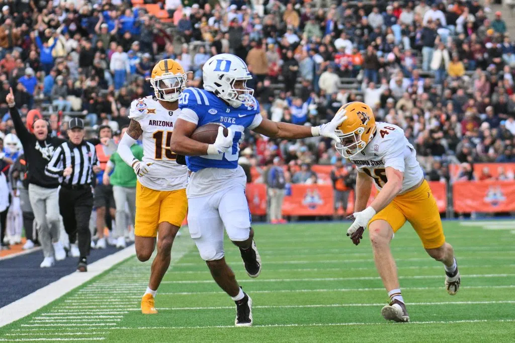 - Running back Nate Sheppard #20 of the Duke Blue Devils stiff-arms defensive back Tommy Romano #46 of the Arizona State Sun Devils during the second half of the Tony The Tiger Sun Bowl game at Sun Bowl Stadium on December 31, 2025 in El Paso, Texas. The Blue Devils defeated the Sun Devils 42-39. (Photo by Sam Wasson/Getty Images)