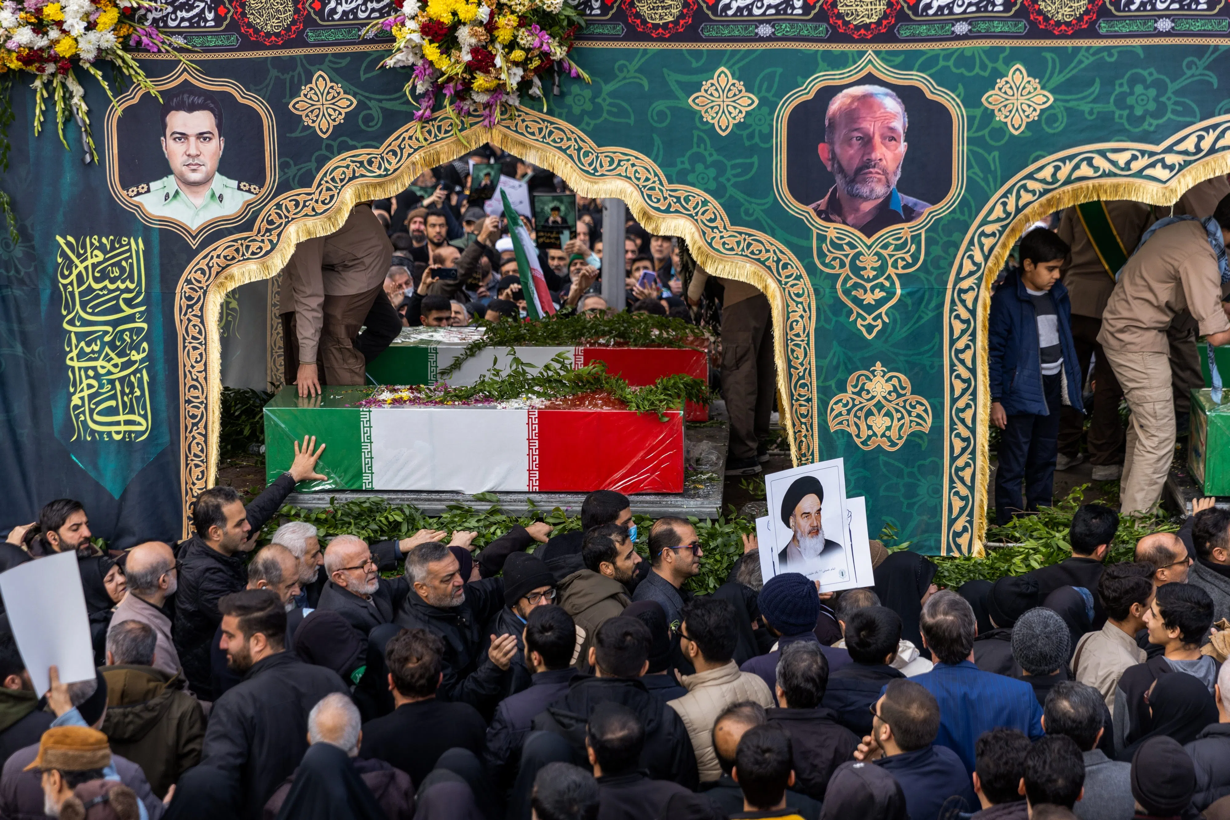 In other developments Wednesday, a mass funeral was held for some 100 security force members killed in the demonstrations. Tens of thousands of mourners attended, holding Iranian flags and photos of Ayatollah Ali Khamenei. The caskets, draped in Iranian flags, stood stacked at least three high. Red and white roses and framed photographs of the dead covered them.