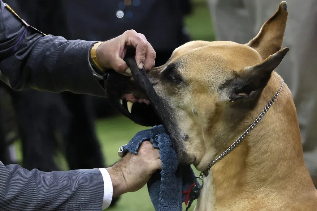 - A Great Dane has his teeth cleaned as he competes in the Working Group during the Westminster Kennel Club Dog Show at Madison Square Garden on February 03, 2026 in New York City. More than 3,000 dogs from all 50 states competed in the 150th Westminster Kennel Club Dog Show. The breeds were divided into seven groups: hound, toy, non-sporting, herding, sporting, working and terrier, with one winner from each group competing for Best in Show. (Photo by Michael M. Santiago/Getty Images)