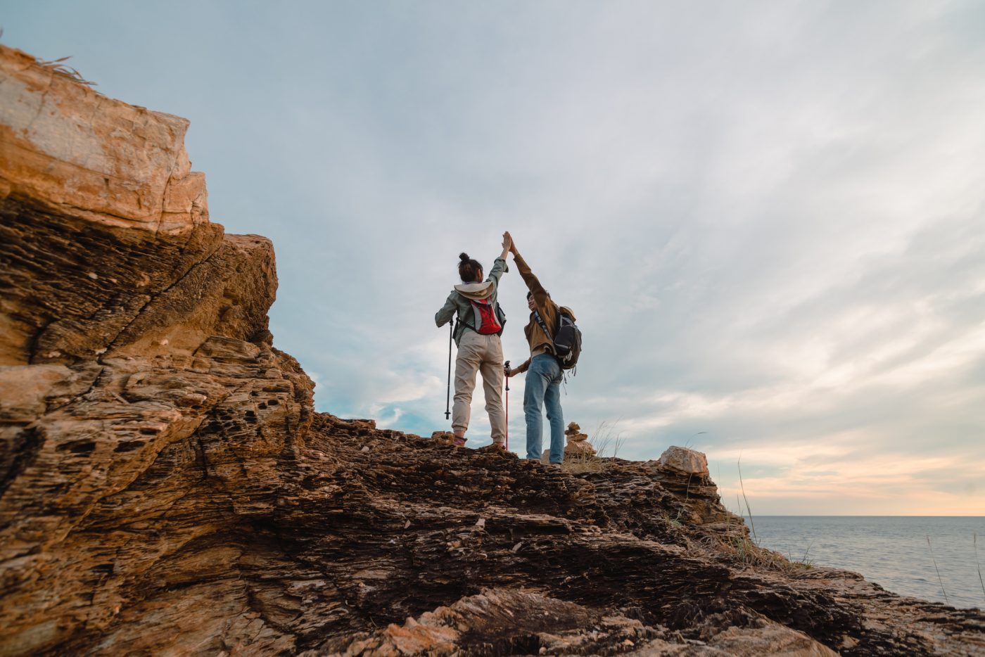 Young Asian couple enjoys trekking climbing up the cliff. A man helps a woman hike up the rock giving hands. teamwork and helps concept.